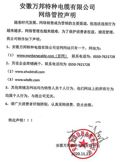 鄭重聲明:安徽萬邦特種電纜有限公司官方網站為:www_wanbangcable_com.dizimia.net,除此之外無任何子網站或合作網站,其余均為假冒偽劣。電話:0550-7621728 13485756353 地 址:安徽省天長市滁州高新技術產業開發區經四路29號